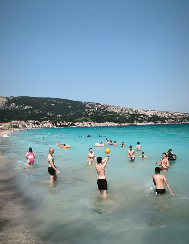 Po kulturnem delu izleta smo se odpravili proti Baški. Kljub nekoliko vetrovnemu vremenu se nismo pustili motiti med številnimi vodnimi dejavnostmi. Poleg osvežitve s plavanjem smo skakali, se žogali, preizkusili napihljiva vodna igrala in se ob vsem tem neizmerno zabavali. Seveda nismo pozabili niti na kosilo, ki nam je povrnilo energijo za nadaljnje vodne norčije.